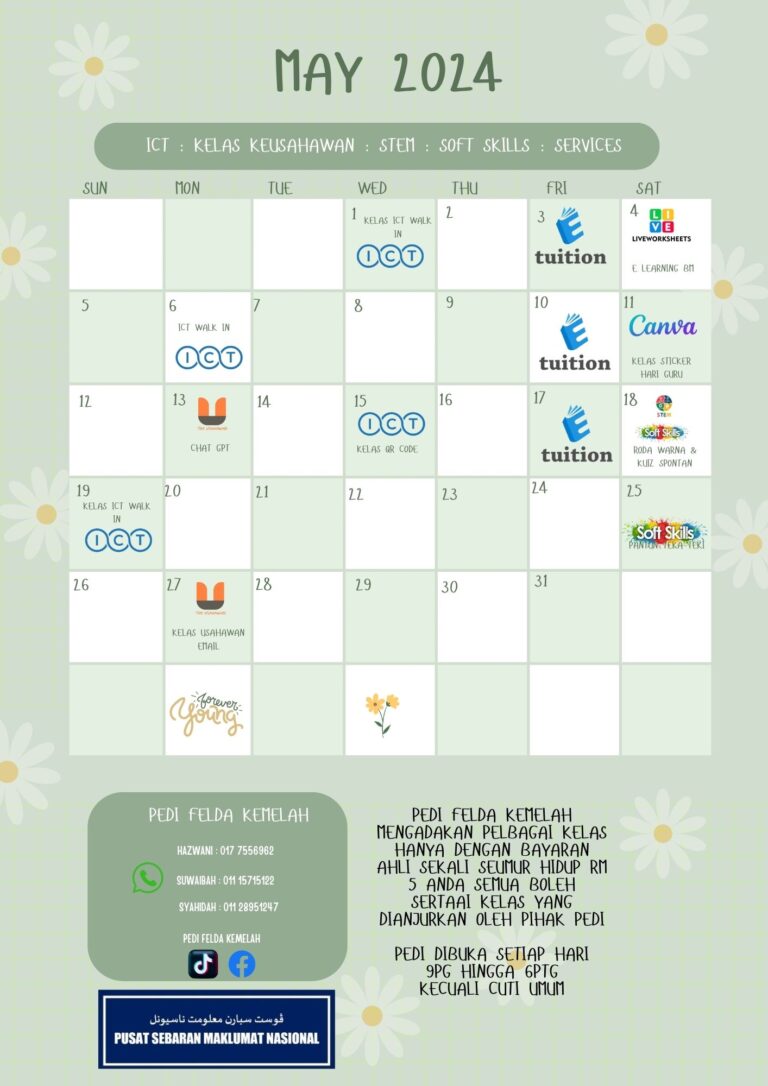 Kelas ICT Di NADi ( Quizzes , kahoot , Word wall) Julai 2024 NADI Felda Kemelah Tujuan : Mempromosikan penggunaan teknologi secara produktif dan beretika, serta menggalakkan inovasi dalam penggunaan ICT dalam kehidupan seharian.Kelas ICT di bawah NADi ini […]